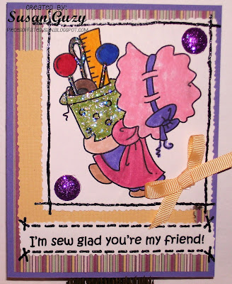 Card stock for the card itself, ribbon and the markers are all STAMPIN' UP. The textured, slightly shiny card stock is older and by MRS. GROSSMAN, The striped paper is new by MY MIND'S EYE. I used Stickles by RANGER on the needle and pins. The glitter buttons were rec'd as a RAK and the package says MICHAEL'S. I used decorative scissors to cut the image, sentiment and card stock. my tiny paper piercer to makes the holes all around the image, across the top and bottom of sentiment, and in the corners. I used my SAKURA Glaze pen in black for my stitching. Running stitch, hand stitch, and cross stitch.
